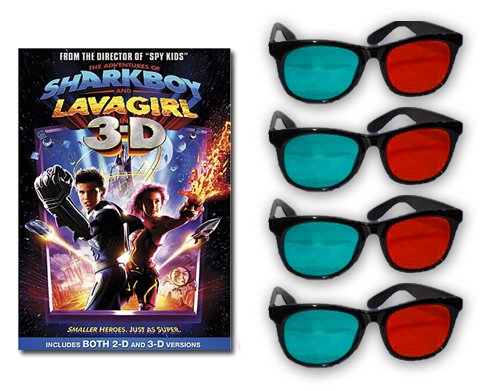 This is the ultimate Sharkboy and Lavagirl package for 3D enthusiasts! What you get: The Adventures of Sharkboy and Lavagirl in 3D! The Adventures of Sharkboy and Lavagirl 2D version (included on disc!) 4 Pair of high quality acrylic 3D glasses for viewing 4 pair of quality printed Official Sharkboy and Lavagirl 3D glasses for additional viewers PLUS special features including: Creating Sharkboy and Lavagirl with Racer Max and feature commentary with Director Robert Rodriguez! This will make the ultimate gift for the 3D enthusiast! All features are included on the DVD. Standard DVD player or computer drive is required for viewing contents. All items pictured are included