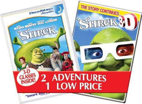 This two-pack contains the single-disc, full-screen version of "Shrek" plus a new 15-minute short, "Shrek 3-D," plus 3-D glasses. Shrek 3-D: When we last left everyone's favorite newlyweds Shrek and Fiona, they were singing and dancing late into the night with Donkey and all the fairytale creatures. Happily ever after...right? Not so fast: The honeymoon has barely begun when Princess Fiona (Cameron Diaz) is ambushed by Lord Farquaad's (John Lithgow) henchman, Thelonius. A dizzying and hilarious chase ensues with Shrek (Mike Myers) and Donkey (Eddie Murphy) hot on the trail! More action, more adventure, more fun that picks up right where Shrek left off...and drops you off laughing and out-of-breath before "Shrek 2" begins!